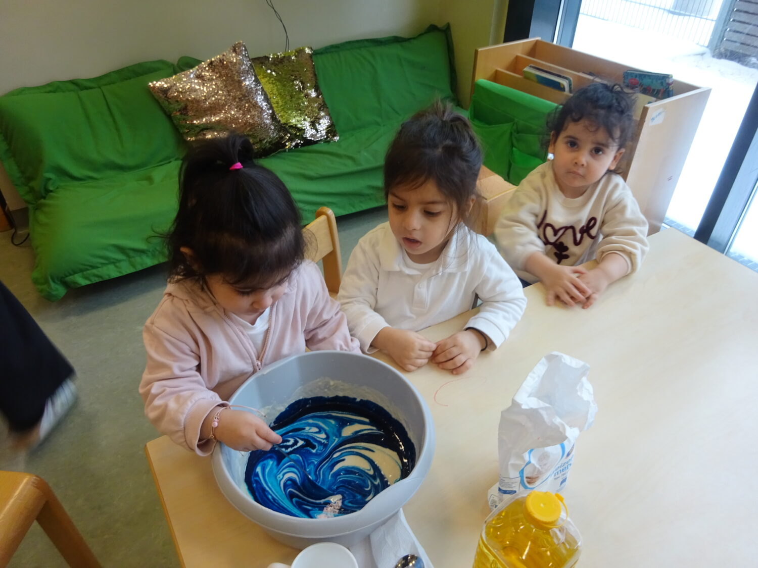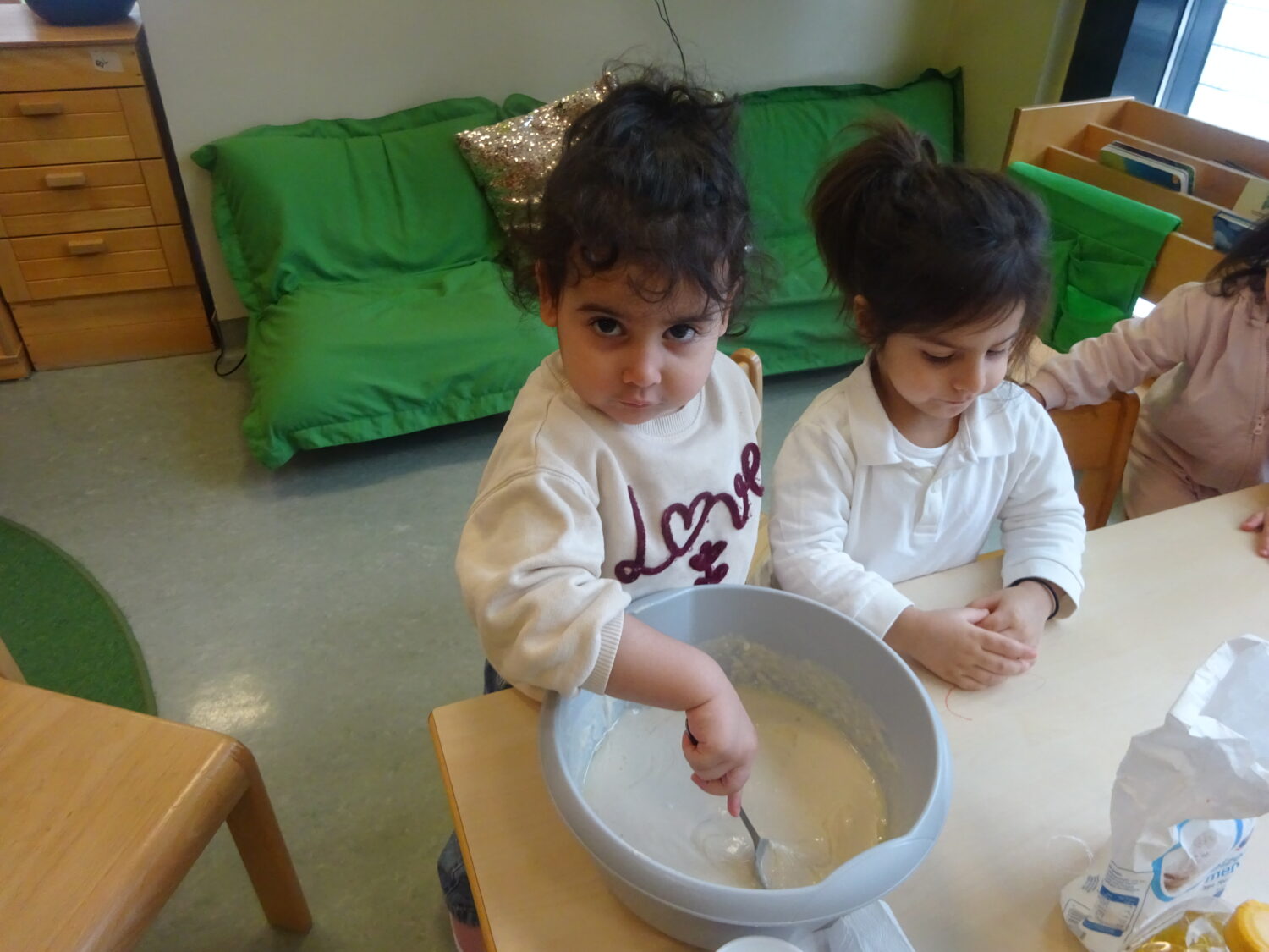 Zusätzlich fördert das gemeinsame Tun die soziale Kompetenz, da die Kinder warten, teilen und miteinander in Kontakt treten. Durch das Benennen der Tätigkeiten und Materialien wird auch die sprachliche Entwicklung unterstützt.